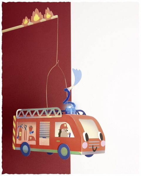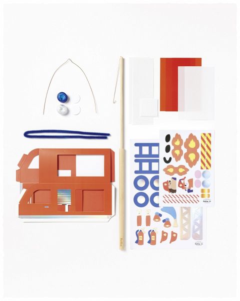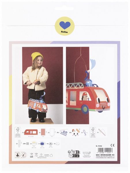 1x vorgestanzter Rohling in Feuerwehrauto-Form, 10,5 x 27 x 10,5 cm; 5x Transparentpapier, 115 g/m 2, rot & weiß, 9 x 16 cm; 1x Chenilledraht, blau, 50 cm; 1x Stanzbogen mit Hotfoil; 1x Stickerbogen mit Hotfoil; 1x Laternenstab aus Holz mit Steckverbindung; 1x Laternendrahtbügel; 1x LED-Dekolicht zum Aufkleben; 1x LED-Blaulicht zum Aufkleben; jeweils Ø 3 x 2,3 cm; 4x Batterien; 2x Blatt mit Klebestreifen, 6 x 19 cm; 100x 3D-Klebepads.
