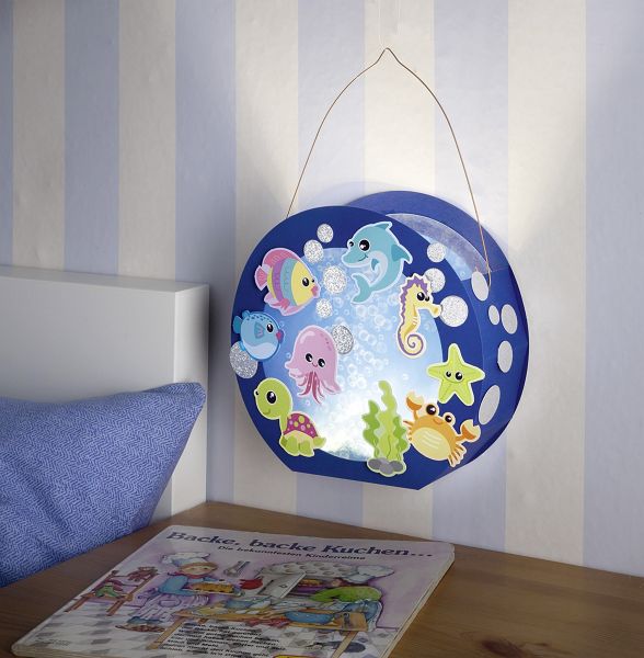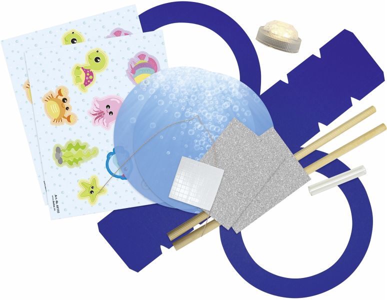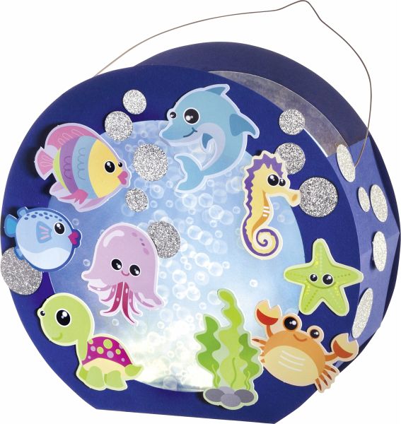 Umfangreiches Laternen-Bastelset; Motiv: Unterwasserwelt; Mit Laternenstab und LED-Licht inkl. Batterien; Inhalt: Motivbögen, Laternenrohling, Transparentpapier, Glitterkarton, Drahtbügel, Klebepads und Bastelanleitung.