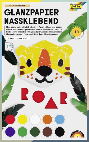 Buntpapiermappe, 18,5 x 29,7 cm, 10 Blatt, 10 farbig sortiert, Farben rot, orange, gelb, weiß, hellblau, dunkelblau, hellgrün, dunkelgrün, braun, schwarz, durch einseitig gummierte Oberfläche klebt das Papier nach dem Anfeuchten auf der Rückseite, das Buntpapier ist für alle Altersgruppen geeignet, Kindergarten, Schule, und für alle die kreativ sind, LGA tested, (Farbänderungen möglich).