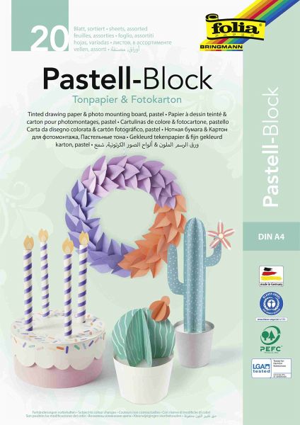 Pastellblock, 20 Blatt im Format DIN A4, hiervon 10 Blatt Tonpapier und 10 Blatt Fotokarton in 10 Pastellfarben sortiert, Farben hellgrau, perlweiß, hellrosa, mint, strohgelb, veilchenblau, lila, aprikose, lachs, eisblau, unbedruckt, Block mit Kopfleimung und 4-farbigem Deckblatt, LGA tested, Made in Germany, PEFC, Blauer Engel