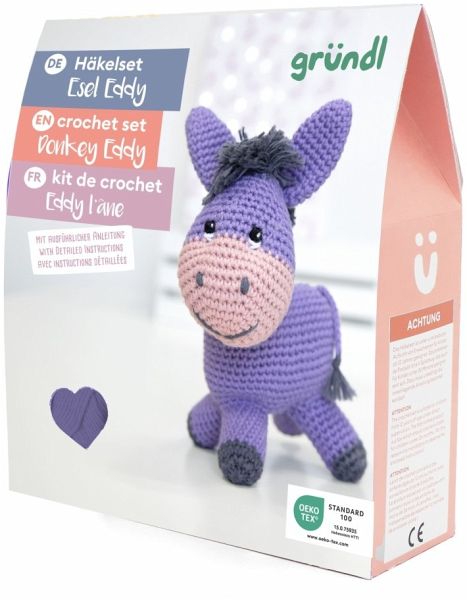 Gründl Häkelset "Esel Eddy" mit komplettem Material und ausführlicher Schritt-für-Schritt-Anleitung zum Häkeln eines niedlichen Waschbären. Mit der Füllwatte wird dem Häkeltier seine Standfestigkeit verliehen. Ein niedliches Kuscheltier für das Kinderzimmer oder auch super zum Verschenken.