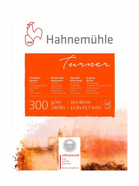 Der hochwertige, aus 100 % Hadern bestehende Echt-Bütten Aquarellpapier „William Turner“ ist naturweiß, säurefrei, lichtbeständig und von höchster Alterungsbeständigkeit. Die Blöcke sind rundum mit einem Gazestreifen verleimt, der eine gute Flachlage gewährleistet. Die Bogen haben unser klassisches Wasserzeichen, den „Hahn“, und einen vierseitigen Büttenrand. Die weiche, unregelmäßige Gewebestruktur der Oberfläche ist hervorragend für den geübten Aquarellisten geeignet. Das Aquarellpapier „William Turner“ ist prädestiniert für alle Nasstechniken: Aquarell, Lavis, Gouache, Tempera und Acryl.