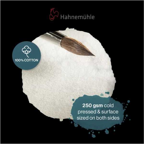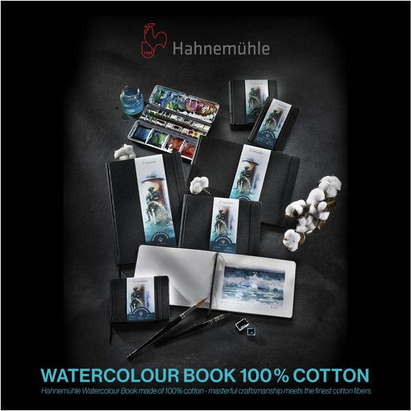 Das Hahnemühle Watercolour Book aus 100 % Baumwollfasern ist ein Must-have für Aquarellkünstler. Die Baumwolle verleiht dem Papier einen natürlichen Weißton, eine unvergleichliche Textur und eine hohe Widerstandsfähigkeit. Farben fließen hervorragend auf dem naturweißen Papier und beflügeln Pinsel und Künstler. Die 30 Blatt des 250 g/m² Papiers haben auf der Vorder- und Rückseite eine homogene, feinkörnige Oberflächenstruktur, so stehen Künstlern 60 Seiten zum kreativen Gestalten zur Verfügung. Das Buch ist für alle Aquarelltechniken geeignet, insbesondere für die Nass-in-Nass-Technik. Maskierstifte und Masking Tapes lassen sich ohne Rückstände entfernen. Selbst Radierungen sind dank Oberflächenleimung problemlos möglich. Der nachtschwarze, stabile Einband mit schwarzem Lesezeichen verleiht dem Buch eine Eleganz und die Stabilität, die es als unverzichtbarer Begleiter benötigt. Ein Gummiband verschließt das Buch fest.