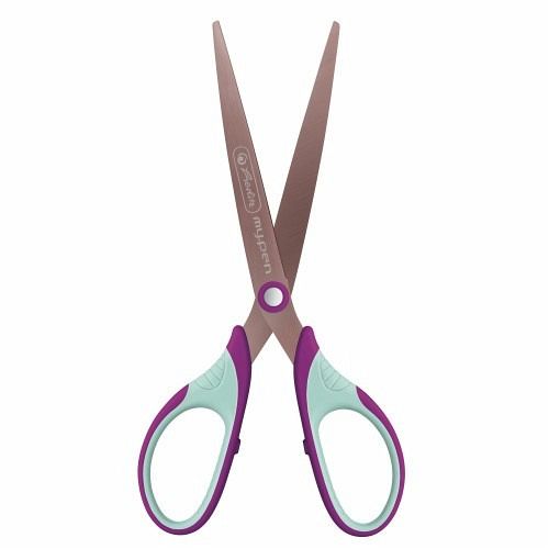Schere my.pen; Ergonomischer Griffbereich durch Materialmix; Material Stahl/Kunststoff; Farbige Scherenblätter; Farbe lila/minze.