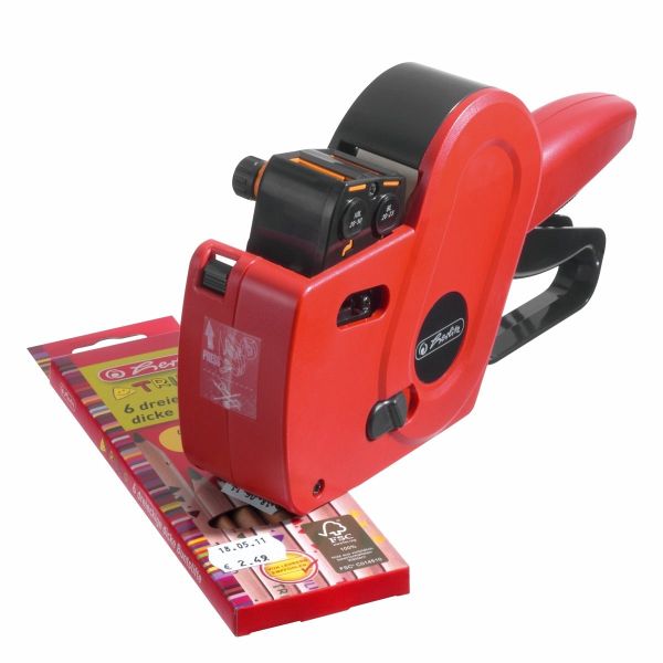 Preisauszeichnungsgerät PAZ 2-zeilig 10/8-stellig, Für Etikettengröße (B x H): 26 mm, 16 mm, Höhe der Schrift: 3 mm, Anzahl der Zeichen pro Zeile: 8 1, max. Anzahl der Druckzeilen: 2 1, Werkstoff: Kunststoff, Polystyrol, PS, mit Metall-Funktionselementen, Größe (B x H x T): 51 mm, 124 mm, 245 mm, Lieferumfang: mit Druck-Farbrolle schwarz und 1.200 Etiketten weiß blanko Kleber permanent, Farbe: rot