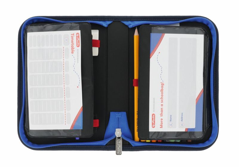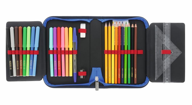 Für Schule; Etui mit 2 Klappen; mit farbigem Reißverschluss; Schlaufen in unterschiedlichen Größen; guter Überblick, farbiges Innenmaterial farbig passend zum Motiv; farbige Stifteschlaufen; Maße: 20,5 x 14 x 3,8 cm; Material: Polyester; Befüllung: mit FSC zertifizierten Bunt- und Bleistiften, Fasermaler; Motiv: High Speed