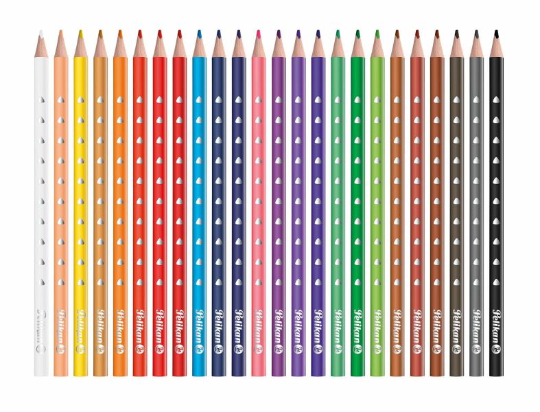 24 Buntstifte dünn, ergonomische Dreikant-Form, mit auffälligem, silbern geprägtem Dreieck-Motiv an allen 3 Seiten, das einen leichten Grip-Effekt erzeugt, mit Namensfeld, bruchstabile Mine, gute Farbabgabe, intensive Farbe, Minendurchmesser: 3mm, 100% FSC® – zertifiziertes Holz.