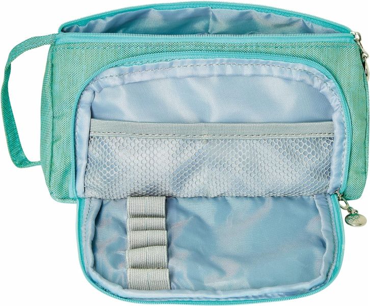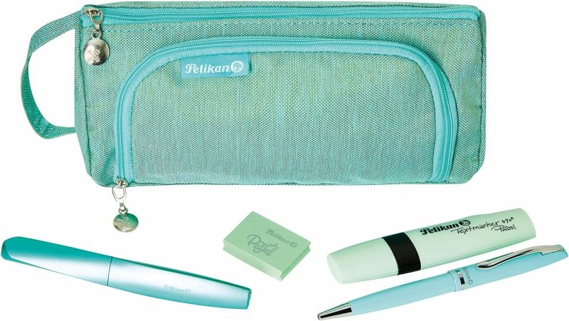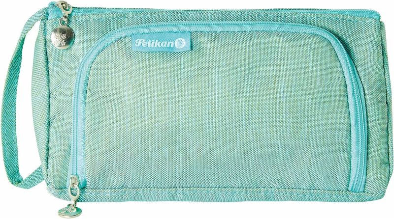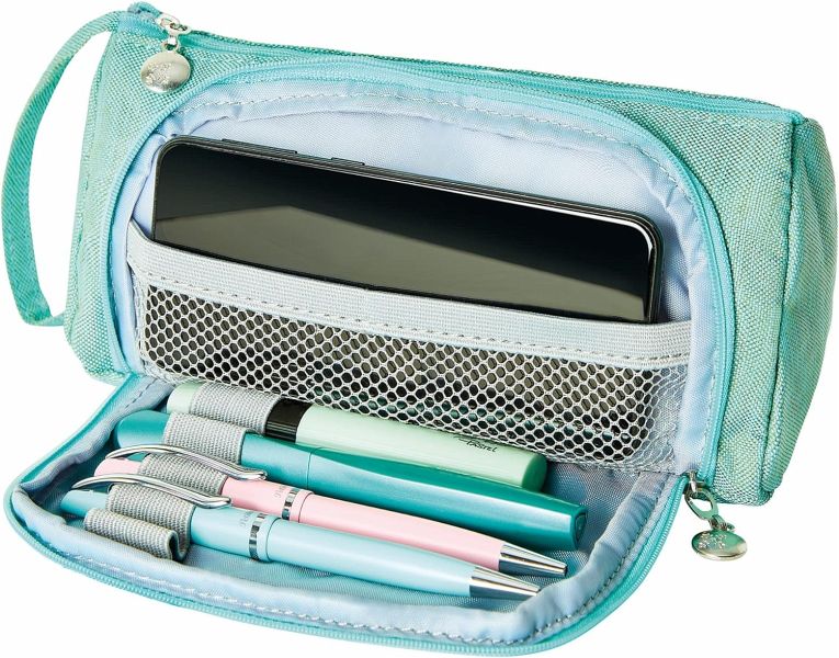 Allrounder; geräumiges Hauptfach mit Reißverschluss und zwei Innenfächern; Fronttasche mit Netzmaterial und Stifte-Schlaufen; leichter Transport; für Schule; Uni; Beruf oder Freizeit; Maße: 22 x 10,5 x 9 cm; Material: Polyester; Canvas Look; mint, unbefüllt