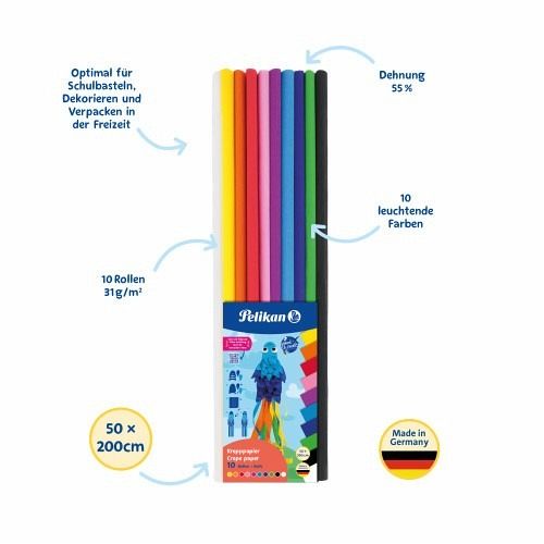 Pelikan Krepppapier - Set Basic in 10 leuchtenden Farben. Die Rollen des hochwertigen Krepppapiers haben die Größe 50 x 200 cm. Optimal für Schulbasteln und Dekorieren und Verpacken in der Freizeit. 10 Rollen verpackt im Polybeutel mit Einleger.