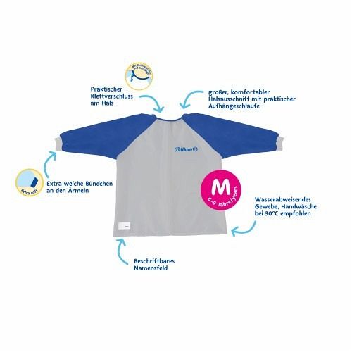 Praktische Malschürze für die Schule und zu Hause. Eine Größe für Kinder im Alter von ca. 6-9 Jahren. Durch Klettverschluss einfach anzuziehen. Mit Aufhängeschlaufe.