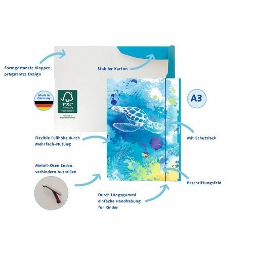 Mit Gummiband zum sicheren Verschließen; Aus stabilem und hochwertigem Karton mit Schutzlack; Mit Namensfeld zur individuellen Beschriftung; Format: A3; Motiv Schildkröte; FSC-Mix Material; Made in Germany.