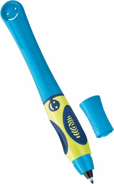 griffix® Tintenschreiber zum Schreibenlernen; Für Linkshänder; Ergonomisches Design; Ideal zum Erlernen von flüssigen Schreibbewegungen; Für den ersten Umgang mit flüssiger Tinte; Druckstabile Faserschreiberspitze; Für ein schönes und sauberes Schriftbild; Gute-Laune-Gesicht zeigt richtige Stifthaltung an; Mit großem Tintensichtfenster; Mit Namensfeld für die individuelle Beschriftung; Mit Lehrern und Wissenschaftlern entwickelt; Inklusive 2 Tintenschreiberpatronen; Farbe: Neon Fresh Blue; Made in Germany