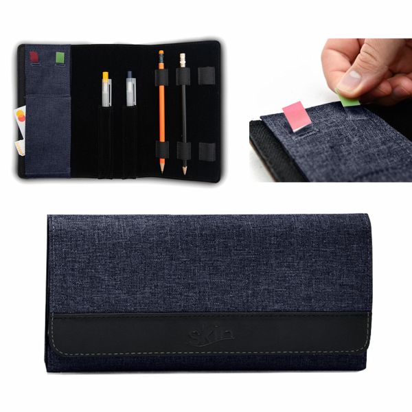 Der PenSkin aus wasserabweisender Mikrofaser in Canvas-Optik dient der Aufbewahrung (Stiftetui) für Schreibaccessoires und Haftstreifen. Diese werden in dem integrierten Spender aufbewahrt und können einfach herausgenommen werden. So sind diese in Ihrem persönlichen Federmäppchen jederzeit griffbereit. Er bietet Platz für 5 Stifte verschiedener Größen, besitzt ein Fach für Spitzer und anderer kleinerer Hilfsmittel & trumpft mit seiner Haftstreifen-Vorrichtung als Spender. Diese können ohne großen Aufwand aus einer Lasche gezogen werden und sind sofort im Einsatz um Textmarkierungen vorzunehmen. Perfekt fürs Studium!