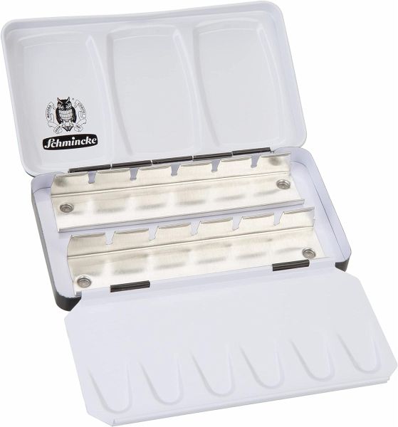 Der HORADAM AQUARELL Metall-Leerkasten zur individuellen Bestückung mit 12 x 1/2 halben Näpfchen HORADAM AQUARELL, mit Mischpalette (L x B x H: 12,8 x 7,2 x 2,3 cm).