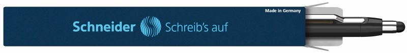 Touchpen für die Bedienung von Tablets und Smartphones. Das weiche Stylus-Käppchen ermöglicht ein präzises Navigieren auf allen kapazitiven Displays und vermeidet Fingerabdrücke. Funktioniert auch mit den meisten Handschuhen. Der Kugelschreiber vereint klassisches Design mit modernen Stilelementen. Für ein unverwechselbares Erscheinungsbild sorgen der teilweise versenkte Metallclip, sowie die farblich abgestimmten gummierten Streifen. Eine im Griffbereich als Interpretation des Firmenlogos umlaufende Dreifachlinie aus Weichkunststoff dient zusätzlich der Rutschfestigkeit. Auswechselbare Großraummine Slider 755 extrabreit (XB) mit Viscoglide®-Technologie für außergewöhnlich leichtes und gleitendes Schreiben. Schreibfarbe blau, dokumentenecht nach ISO 12757-2. Die verschleißfeste Edelstahlspitze garantiert, dass der große Pastenvorrat vollständig und schmierfrei genutzt werden kann. Der Epsilon hat einen federnden Metallclip und ist durch das clevere Plug+Play-System mit verschiedenen Minenformaten nachfüllbar.