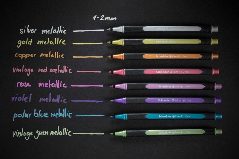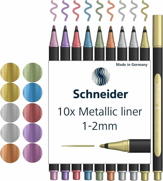 Metallicliner ideal für metallische Akzente bei deinen DIY Projekten. Gehäuse aus 88% biobasiertem Kunststoff. ,Hochwertige metallic Tinte für beste Ergebnisse beim Handlettering, Bulletjournaling und vielem mehr. Strichstärke ca. 1-2 mm. Schachtel mit 10 Stück: silver metallic (2x), gold metallic (2x), copper metallic, vintage green metallic, polar blue metallic, vintage red metallic, frosted violet metallic, rose metallic. Schütteln und Pumpen ist nicht notwendig - Kappe abziehen und loslegen. Ideal geeignet für gestrichenes Papier, wie Einladungs- und Grußkarten oder anderen glatten und nichtsaugenden Untergründen. Schnelltrocknend und geruchsarm.
