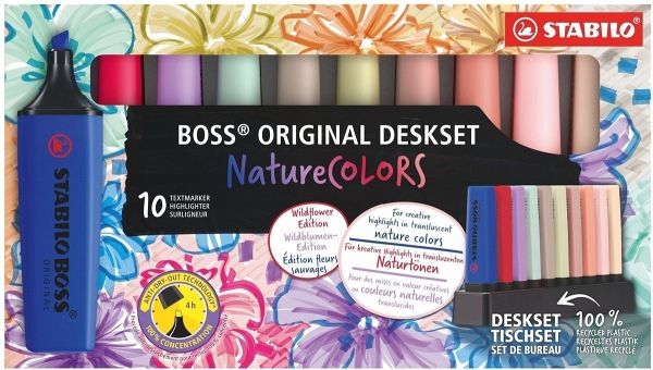 Der STABILO BOSS ORIGINAL NatureCOLORS Wildflower Textmarker überzeugt mit modernen Farbtönen und einer dezenten Leuchtkraft, die jedes Dokument oder Lernmaterial besonders macht. Die vier Farben ultramarinblau, burgunderrot, grauviolett und rouge sind ideal für alle, die angesagte Farben aus Interior- und Modedesign auch bei Schreibwaren nicht missen möchten. Ausgestattet mit der STABILO Anti-Dry-Out Technology bleibt der hochwertige Textmarker bis zu 4 Stunden ohne Kappe einsatzbereit, perfekt für längere Lernsessions. Die vielseitige Keilspitze ermöglicht Strichbreiten von 2 mm und 5 mm,…mehr
