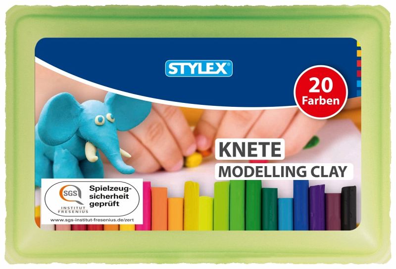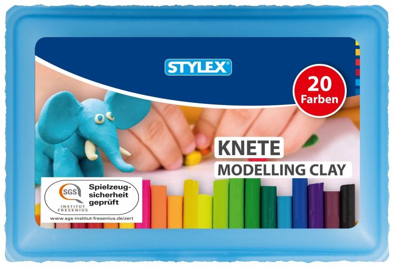 20 Stangen Knete, Farbsortierung: 6 Neonfarben, 14 Standardfarben, jeweils 10 Stangen eingeschrumpft, in wiederverschließbarer Kunststoffbox.