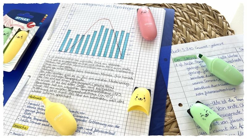 2 Mini-Textmarker im Katzendesign, Kappe mit Katzengesicht bedruckt, Strichstärke 1-4 mm, praktische Keilspitze ist ideal zum feinen Unterstreichen oder Markieren von Texten, brilliante Farbintensität, farbig sortiert, in Kartonschachtel