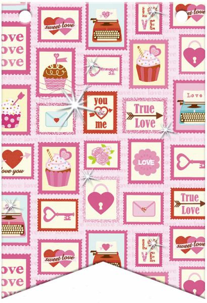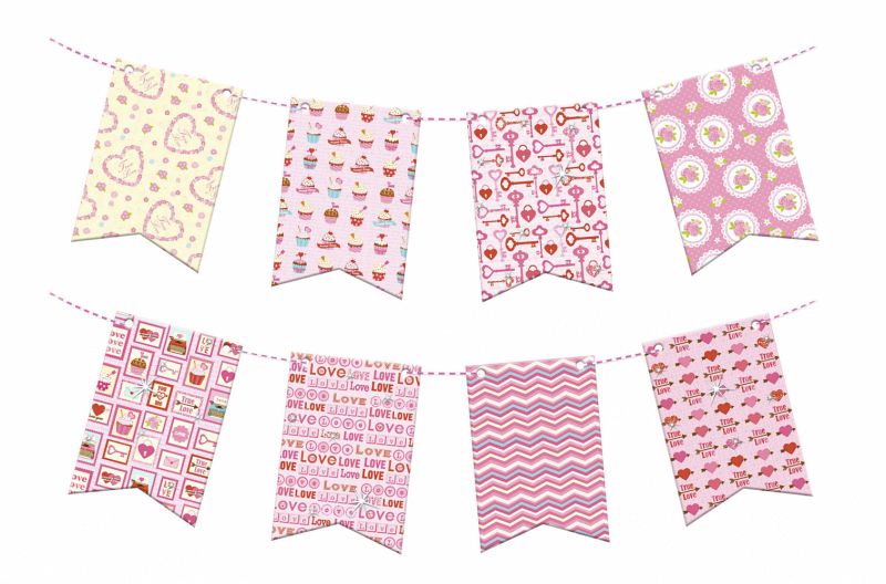 24 beidseitig bedruckte Wimpel in acht verschiedenen Designs samt 40 cm Kordel zum Erstellen einer Wimpelkette.