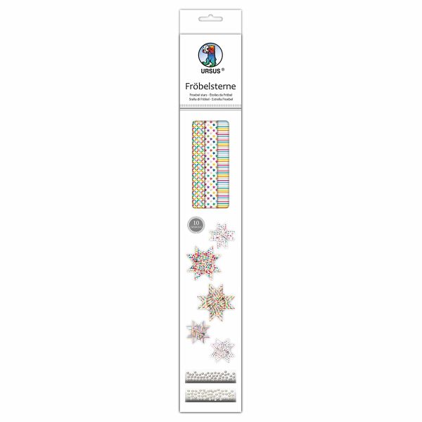 Fröbelsterne "Multicolour", Set enthält Materialien für 15 Fröbelsterne, Inhalt: 40 Faltstreifen 1,5 x 45 cm sortiert in 5 Designs, 20 Faltstreifen 2,5 x 86 cm sortiert in 5 Designs, aus hochwertigem Bastelpapier 120 g/m², beidseitig bedruckt, 50 Schmucksteine und Halbperlen, inklusive Faltanleitung