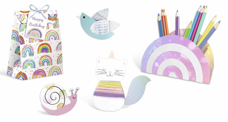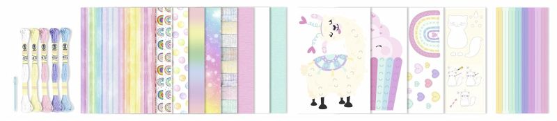 6 Blatt Motiv-Fotokarton (300 g/m², 23 x 33 cm) sortiert in 6 verschiedenen Dewsigns, 3 Blatt Fotokarton (285 - 300 g/m², 23 x 33 cm) sortiert in 3 verschiedenen Farben, 2 Flechtbogen (23 x 33 cm) sortiert in 2 verschiedenen Designs, 1 Bogen mit Stanzteilen (23 x 33 cm), 16 Flechtstreifen (1 x 33 cm) sortiert in verschiedenen Farben, 5 Docken Stickgarn (je 8 m) sortiert in 5 verschiedenen Farben, 1 Sticknadel