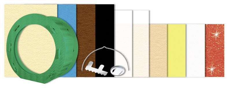 1 Laternen-Stanzteil (Ø 21,8 cm, Breite 21,8 cm, Höhe 21 cm, Tiefe 10,3 cm), 2 Blatt Transparentpapier (DIN A4), 4 Blatt Fotokarton (23 x 33 cm), 3 Blatt Fotokarton (DIN A5), 1 Blatt Flitter paper (16,5 x 23 cm), 1 Kerzenhalter, 1 Laternentragebügel und 1 Vorlagebogen