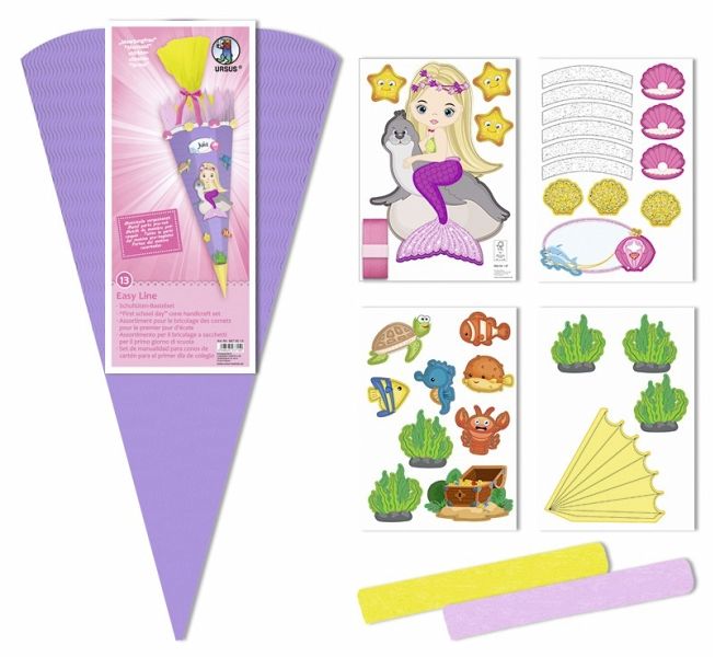 1 Schultüte aus 3D-Colorwellpappe, 2 Rollen Bastelkrepp (250 x 50 cm), 1 Satinband und diverse Stanzteile (teilweise folienveredelt)