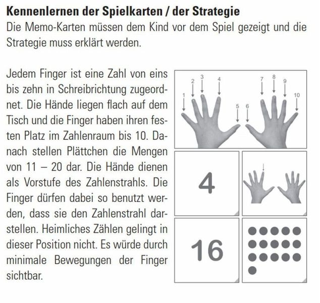 Das Spiel bereitet auf die vier Grundrechenarten vor, schult das Zahlenverständnis und die Orientierung im Zahlenraum von 1 bis 20. Bei diesem Memo-Spiel üben die Kinder ohne abzuzählen, die Zahlen 1 - 10 der richtigen Position auf dem Zahlenstrahl und die Zahlen 11 - 20 der passenden Menge zuzuordnen. Die Finger dienen als Vorstufe des Zahlenstrahls, auf dem jeder Finger seinen festen Platz hat.