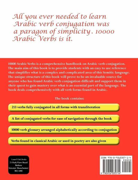 10000 Arabic Verbs is a paragon of simplicity and removes the complexities often associated with this problematic subject area. Thus ensuring that this is the only book you'll ever need on Arabic verb conjugation. Each of the 213 fully conjugated verbs, acting as paradigms, has been allocated a number and all verbs with the corresponding number in the verb list conjugate in exactly the same way. What is unique is instead of having a long verb list, the verbs in the list have instead been arranged according to conjugation. For ease of navigation, a list of all the conjugated verbs has been given at the beginning of the book. All verb patterns have been dealt with comprehensively including some rare verb patterns.