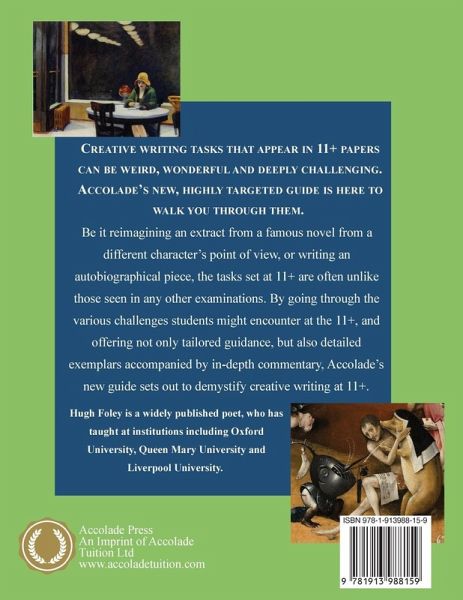 Creative writing tasks that appear in 11+ papers can be weird, wonderful and deeply challenging. Accolade's new, highly targeted guide is here to walk you through them. Be it reimagining an extract from a famous novel from a different character's point of view, or writing an autobiographical piece, the tasks set at 11+ are often unlike those seen in any other examinations. By going through the various challenges students might encounter at the 11+, and offering not only tailored guidance, but also detailed exemplars accompanied by in-depth commentary, Accolade's new guide sets out to demystify creative writing at 11+. Hugh Foley is a widely published poet, who has taught at institutions including Oxford University, Queen Mary University and Liverpool University.