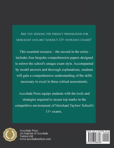 Looking for a definitive guide for the Merchant Taylors' School 13+ entrance exams? Accolade Press has crafted a resource specifically tailored to help your child ace the Merchant Taylors' School Assessment. This volume includes four comprehension papers mirroring Merchant Taylors' School's unique exam style. With our book, your child will gain a comprehensive understanding of the skills necessary to excel in these vital assessments. Our expertly authored guide (the second in the series) not only offers insights into Merchant Taylors' School Admissions for 13+, but also equips students with strategies for securing top results, and subsequently boosting Merchant Taylors' School acceptance rates. Key features include: Comprehension papers reflecting Merchant Taylors' School's distinctive style, ensuring students are thoroughly prepared for exams in 2023, 2024, and 2025. Diverse extracts to test a range of skills in line with the Merchant Taylors' School entrance exam past papers. Comprehensive model answers for each question, with alternative solutions demonstrating how high marks can be achieved through various approaches. Detailed explanations accompanying each answer, clarifying complex concepts and vocabulary while showing how responses meet examiners' expectations. Authored by a skilled tutor with an impressive track record in 13+ admissions, this book is your child's comprehensive companion for Merchant Taylors' School's rigorous 13+ assessment. Equip your child with this guide and take a confident stride towards Merchant Taylors' School Admission.