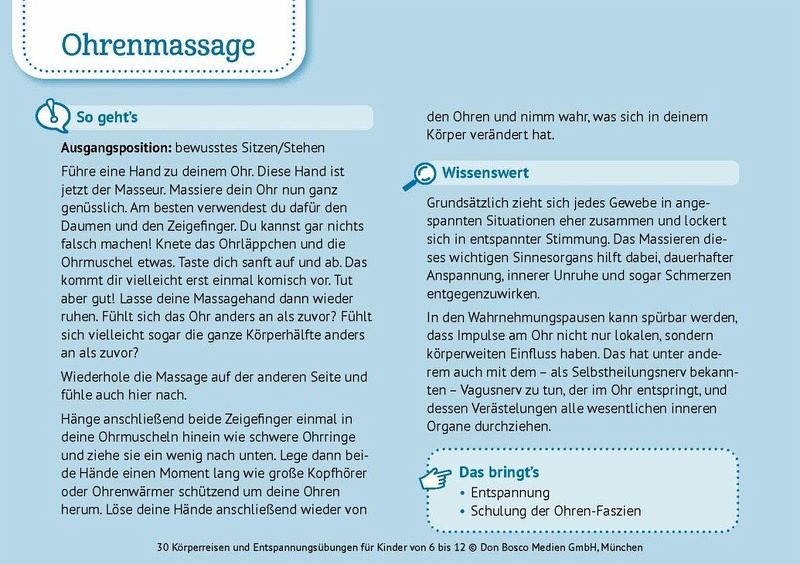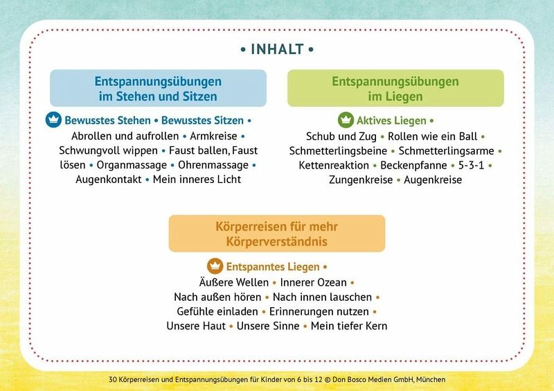 Alle Übungen sind einfach umzusetzen und können sich für jedes Kind ein bisschen anders anfühlen. Die Kinder lernen wichtige anatomische Zusammenhänge in ihrem Körper kennen und nehmen diese dadurch bewusster wahr. Ein Bildkarten-Set, das für kurze Auszeiten im Alltag sorgt und Entspannungstechniken für Kinder vorstellt, die auch Erwachsene stärken!