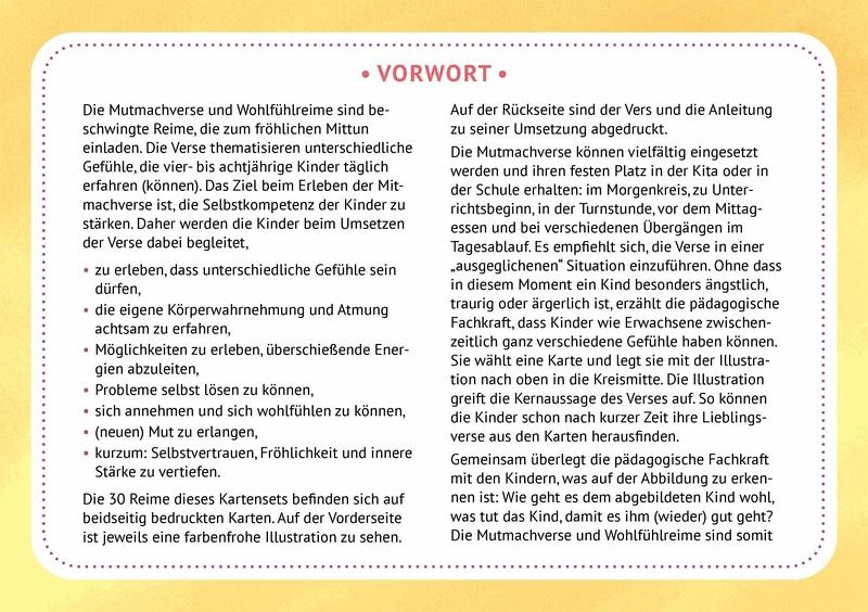 Von lustig bis betrübt - Kindergarten- und Grundschulkinder machen täglich viele Gemütszustände und Situationen durch. Manchmal kann das ein bisschen überwältigend sein: Wohin mit der überschießenden Energie oder der großen Wut im Bauch? Mit diesen Bildkarten werden Gefühle und typische Erlebnisse für Kinder besser verständlich. Wichtig ist, wie wir damit umgehen! Die Mitmachreime sind leicht zu merken und unterstützen auch abseits des Mitsprechens in der Gruppe dabei, die eigene Laune zu erkennen, den Körper wahrzunehmen, Probleme selbst lösen zu können und zu Selbstvertrauen und Fröhlichkeit zu gelangen. Ein Reim auf jedes Gefühl - stärken Sie spielerisch die Selbstkompetenz der Kinder in Ihrer Gruppe oder Klasse!
