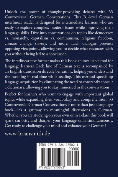 Unlock the power of thought-provoking debates with 33 Controversial German Conversations. This B1-level German interlinear reader is designed for intermediate learners who are ready to explore complex, modern issues while improving their language skills. Dive into conversations on topics like democracy vs. monarchy, capitalism vs. communism, religious freedom, climate change, slavery, and more. Each dialogue presents opposing viewpoints, allowing you to decide what resonates with you without being led to a conclusion. The interlinear text format makes this book an invaluable tool for language learners. Each line of German text is accompanied by an English translation directly beneath it, helping you understand the meaning in real-time while reading. This method speeds up language acquisition by eliminating the need to constantly consult a dictionary, allowing you to stay immersed in the conversations. Perfect for learners who want to engage with important global topics while expanding their vocabulary and comprehension, 33 Controversial German Conversations is more than just a language book-it's a gateway to meaningful discussions in German. Whether you are studying on your own or in a class, this book will spark curiosity and sharpen your language skills simultaneously. Get ready to challenge your mind and enhance your German!