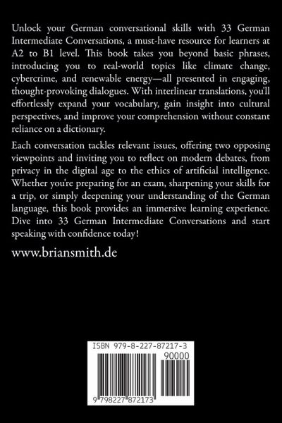 Are you ready to take your German to the next level? Dive into 33 German Intermediate Conversations, designed for learners at A2 to B1 level, offering you an engaging and practical way to improve your language skills while exploring real-world topics. In this book, you'll find a wide range of contemporary discussions-from cybercrime and climate change to renewable energy and universal healthcare. Each conversation presents two opposing viewpoints, giving you the chance to reflect and form your own opinions on issues that shape our modern world. Learn smarter with interlinear texts: German dialogues are paired with English translations line-by-line. This method allows you to understand new vocabulary and phrases in context without breaking the flow of reading. Perfect for learners who want to progress without getting stuck in a dictionary! Whether you're studying for an exam, practicing for travel, or simply want to expand your German conversational skills, 33 German Intermediate Conversations is your go-to resource. Topics include: Cybercrime Climate Change Exploitation of Workers Artificial Intelligence Data Privacy Refugee Crisis Cryptocurrency Space Exploration ...and much more! Enhance your vocabulary, improve your comprehension, and get comfortable discussing today's most pressing issues-all while improving your German. Start reading today and level up your language skills!