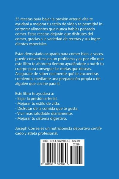 35 recetas para bajar la presión arterial alta te ayudará a mejorar tu estilo de vida y te permitirá incorporar alimentos que nunca habías pensado comer. Estas recetas dejarán que disfrutes del comer, gracias a la variedad de recetas y sus ingredientes especiales. Estar demasiado ocupado para comer bien, a veces, puede convertirse en un problema y es por ello que este libro te ahorrará tiempo ayudándote a nutrir tu cuerpo para conseguir las metas que deseas. Asegúrate de saber realmente qué te encuentras comiendo, mediante una preparación propia o de alguien que cocine para ti. Este libro te ayudará a: - Bajar la presión arterial. - Mejorar tu estilo de vida. - Disfrutar de la comida que te gusta. - Vivir más saludable diariamente. - Mejorar tu sistema digestivo. ¿Qué es la hipertensión arterial? La presión arterial consiste en la presión de la sangre sobre las paredes de las arterias. En circunstancias normales la presión arterial se eleva y cae durante todo el día. Sin embargo, cuando se mantiene elevada en el tiempo, se llama presión arterial alta. El término médico para esta afección se denomina Hipertensión. Una presión arterial alta de 140/90 mmHg ya encaja con hipertensión, mientras que entre 120/80 mmHG y 139/89 mmHg es una alarma de que a futuro puede alcanzarse la hipertensión, si es que no se toman medidas. Existen factores de riesgo que no se pueden controlar, como la edad (hombres mayores de 55 y mujeres mayores de 65) o un historial de afecciones cardíacas tempranas. Si puede controlarse en una presión arterial elevada: diabetes, peso, actividad física, colesterol, tabaquismo, o lo que llamamos estilo de vida.