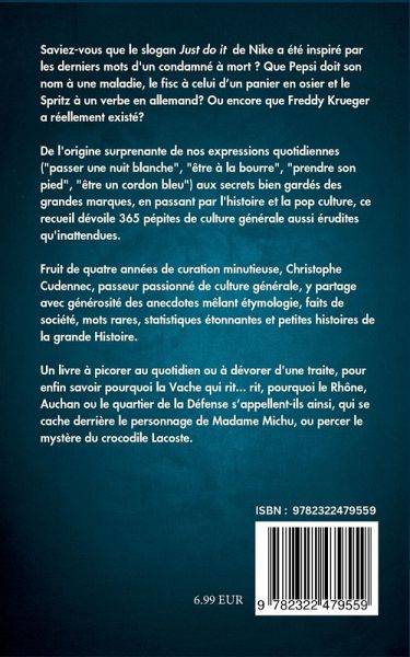 Saviez-vous que le slogan Just do it de Nike a été inspiré par les derniers mots d'un condamné à mort? Que Pepsi doit son nom à une maladie, le fisc à celui d'un panier en osier et le Spritz à un verbe en allemand? Ou encore que Freddy Krueger a réellement existé? De l'origine surprenante de nos expressions quotidiennes ("passer une nuit blanche", "être à la bourre", "prendre son pied", être un cordon bleu") aux secrets bien gardés des grandes marques, en passant par l'histoire et la pop culture, ce recueil dévoile 365 pépites de culture générale aussi érudites qu'inattendues. Fruit de quatre année de curation minutieuse, Christophe Cudennec, passeur passionné de culture générale, y partage avec générosité des anecdotes mêlant étymologie, faits de société, mots rares, statistiques étonnantes et petites histoires de la grande Histoire. Un livre à picorer au quotidien ou à dévorer d'une traite, pour enfin savoir pourquoi la Vache qui rit...rit, pourquoi le Rhône, Auchan ou le quartier de La Défense s'appellent-ils ainsi, qui se cache derrière le personnage de Madame Michu, ou percer le mystère du crocodile Lacoste.