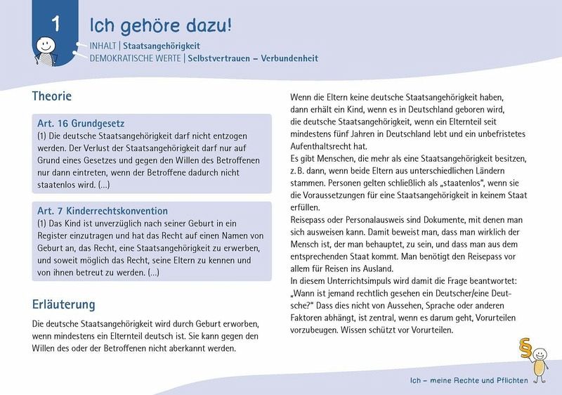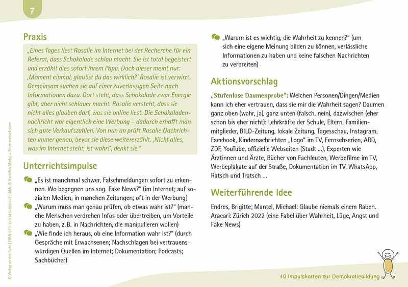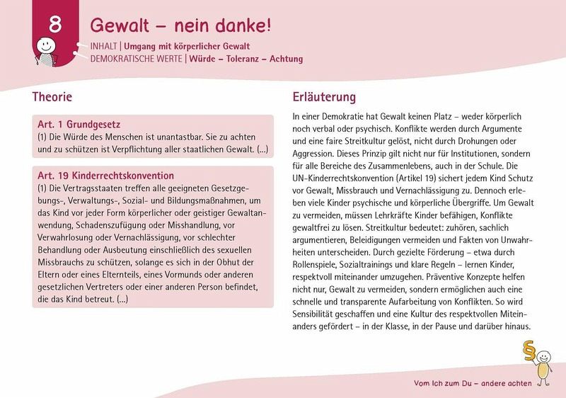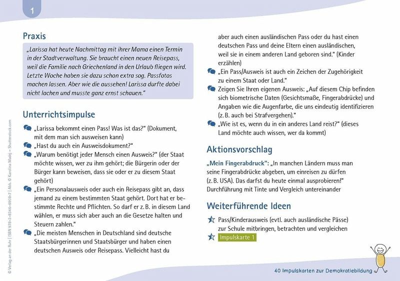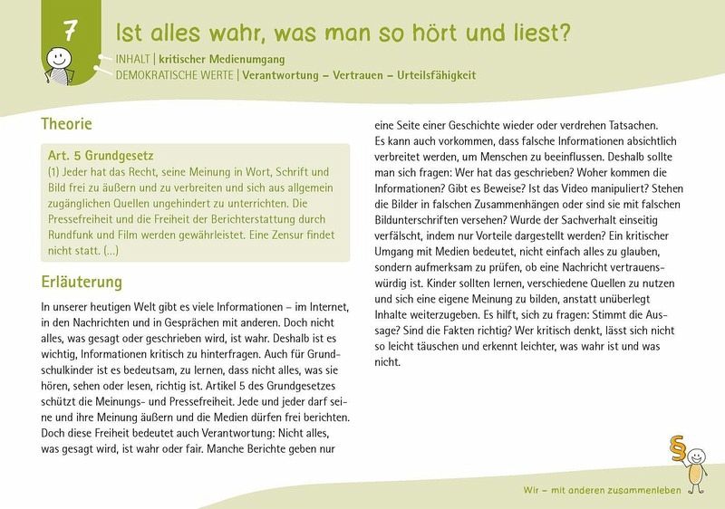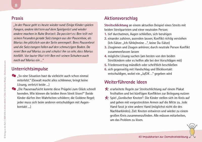 Karteikarten zur Demokratiebildung für Lehrer und Lehrerinnen an Grundschulen und Förderschulen, Sachunterricht, Klasse 2-4 +++So fördern Sie Demokratiebildung im Klassenzimmer: Dieses praktische Kartenset unterstützt Sie als Lehrkraft in den Klassen 2 bis 4 dabei, Kindern wichtige Werte und Prinzipien des Grundgesetzes nahezubringen. Jede Karte bietet auf der Vorderseite Hintergrundinformationen zum jeweiligen Grundgesetz und auf der Rückseite dazu passende ausgearbeitete Unterrichtsideen - von Geschichten bis zu Gesprächsanlässen aus der Lebenswelt der Kinder.Ohne aufwändige Vorbereitung sofort einsetzbarBehandelt zentrale Themen wie Freiheit, Privatsphäre, Wahlen und das SchulwesenIdeal für kurze Unterrichtseinheiten und die Verfassungsviertelstunde in BayernKompakt und übersichtlich in einer praktischen AufbewahrungsmappeEin wertvolles Hilfsmittel für Ihren Unterricht, das Demokratieerziehung auf einfache und anschauliche Weise unterstützt.