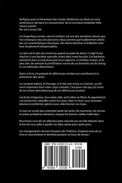 46 Repas pour la Prévention des Cavités: Renforcez vos dents et votre santé bucco-dentaire en consommant de la nourriture emballée d'éléments nutritifs Par Joe Correa CSN Un magnifique sourire, sain et confiant, est une des premières choses que l'on remarque chez une personne. Nous sommes particulièrement attirés par ces caractéristiques physiques. Des dents blanches et brillantes sont tout simplement indispensables. La plupart des médecins s'accordent sur le fait que les dents sont extrêmement importantes pour votre santé et qu'elles sont tellement connectées au reste de votre corps qu'elles peuvent faire beaucoup de dégât si elles ne sont pas bien entretenues. La carie est le pire des ennemies quand on parle de dents. Il s'agit d'une réaction à une bactérie naturelle vivant dans notre bouche. Ces bactéries arrivent là avec la nourriture que nous ingérons. Le meilleur moyen, et le plus sain, de prévenir la prolifération nocive de ces bactéries est de changer vos habitudes alimentaires. Avoir une bonne hygiène dentaire est important pour vos dents, mais il est encore plus essentiel d'avoir une bonne hygiène de vie et une alimentation adaptée. Notre nourriture joue un rôle primordial dans la prévention des caries et dans le maintien d'un bon état de santé en général. Dans ce livre, j'ai préparé de délicieuses recettes qui contribuent à la prévention des caries. Les produits laitiers, le fromage, et le lait sont riches en Calcium, un élément important dont votre corps a besoin. C'est pour cela que j'ai choisi de les inclure dans beaucoup de ces délicieuses recettes. Les fruits et légumes, d'un autre côté, sont riches en fibres. Ils apporteront une protection naturelle contre les caries. Dans ce livre, vous trouverez plusieurs excellentes options pour sélectionner vos repas. Si vous ne voulez plus entendre parler de caries, de couronnes, de racines et autres problèmes dentaires, essayez les bonnes vieilles méthodes ! Nourrissez-vous de ces délicieux plats naturels qui ont été élaborés dans le but de vous aider à garder vos dans saines jours après jours. Les changements viennent toujours de l'intérieur. Emparez-vous de ce livre et vous éviterez le dentiste pendant un bout de temps!