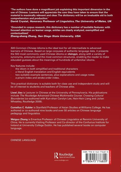 "An important part of Chinese culture, idioms have a long history in China. Proper use of idioms often reflects education level and language skills. Because Chinese idioms are frequently associated with literary allusions, quotations, or metaphors ingrained in Chinese history and literature, they are rather challenging for non-native learners of Chinese to understand or use appropriately. Keeping learners' usage in mind, Jiao (Univ. of Pennsylvania), Kubler (Williams College), and Zhang (emer., Renmin Univ. of China) present the 500 most commonly used idioms, based on frequency statistics of large corpuses of language data used in both China and Taiwan....Readers will find the number of the entry, the idiom in simplified and traditional characters, Pinyin Romanization, English translation, example sentences, comments on usage, allusions, a note on sociolinguistic function, near synonyms, and antonyms. Material in the appendixes includes the common structural patterns of Chinese idioms. This volume is suitable for intermediate to advanced learners of Chinese when used in conjunction with a standard Chinese-English dictionary. Summing Up: Recommended. Upper-division undergraduates and above." - K. T. Wei, University of Illinois at Urbana-Champaign, USA