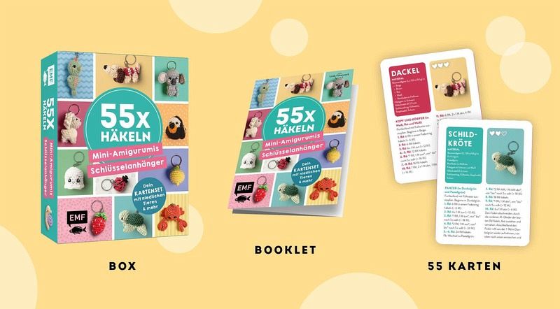 Entdecke die wohl niedlichste Sammlung gehäkelter Minifiguren in einer Box: 55 Karten mit liebevoll gestalteten Anleitungen für Tiere, Glücksbringer, Früchte und mehr - von Dackel und Panda über Regenbogen bis zu Sonnenblume und Donut. Jede Karte zeigt ein Foto des fertigen Projekts und erklärt Schritt für Schritt, wie du deinen eigenen Mini-Amigurumi-Schlüsselanhänger häkelst. Ein illustriertes Booklet mit allen Häkelgrundlagen sorgt dafür, dass auch Anfänger_innen sofort loslegen können. Außerdem liegen in der Box drei Schlüsselringe bereit, sodass deine fertigen Amigurumis direkt einsatzbereit sind.
