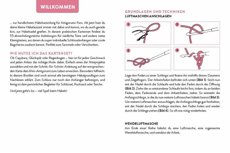 Mit Karte und Booklet Schritt für Schritt zum süßen BegleiterBesonders praktisch: 3 Schlüsselringe aus Metall inklusiveKunterbunte Auswahl aus 55 Projekten - ob tierisch süß oder einfach zum AnbeißenPerfekt für unterwegs und zwischendurch: die Mini-Amigurumis sind mit wenig Garn super schnell gehäkelt