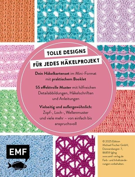 Willkommen in der Welt des Häkelns! Dieses Kartenset bietet alles für den Einstieg in die Welt des Häkelns und dient als Nachschlagewerk, das immer wieder gerne zur Hand genommen wird. Bestückt mit 55 sorgfältig ausgewählten Häkelmustern, die wie eine kleine Häkelmuster-Bibel zusammengestellt sind, ist für jedes Projekt immer das richtige Muster zur Hand, für Anfänger_innen genauso praktisch wie für echte Häkel-Profis. Ergänzt wird das Kartenset durch ein praktisches Booklet, das die wichtigsten Häkelgrundlagen anschaulich illustriert erklärt.