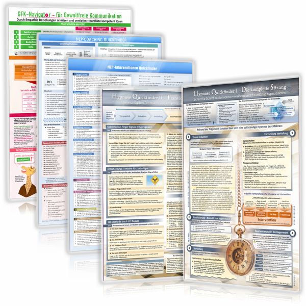 Produktbeschreibung für das 5er Set:Wissenskarte, DINA4, laminiert - GFK-Navigator für Gewaltfreie KommunikationWissenskarte, DINA4, laminiert - NLP Coaching QuickfinderWissenskarte, DINA4, laminiert - NLP Interventionen Quickfinder Wissenskarte, DINA4, laminiert - Hypnose Quickfinder I - Die Komplette SitzungWissenskarte, DINA4, laminiert - Hypnose Quickfinder II - Transformation in Trance Es folgen die Produktbeschreibungen der Einzelprodukte:Wie oft erleben wir im Alltag, dass wir uns durch wenige gesprochene, bzw. gehörte Worte plötzlich unwohl fühlen oder unser Gegenüber nicht zu verstehen scheint, wie wichtig uns etwas ist? Missverständnisse schwächen unsere Beziehungen zu Familie, Partner, Freunden und Kollegen. Wir bitten jemanden und er versteht es als Forderung. Ein anderes Mal hören wir einem Freund bei seinen Leidensgeschichten zu und wissen nicht, wie wir reagieren sollen, um ihm zu helfen. Der GFK-Navigator bietet dir eine umfassende Übersicht, sowie viele kleine Schritt-für-Schritt-Anleitungen, um bei deiner Kommunikation Missverständnisse zu vermeiden und in verständnisvoller, einfühlender Verbindung zu bleiben. Empathie ist der Schlüssel, wie Du Deine eigenen Bedürfnisse besser wahrnehmen und dich in die Bedürfnisse anderer einfühlen kannst. Der GFK-Navigator will dir Kompass und Karte sein, um diese innere Haltung des mitfühlenden Bedürfnisforschers in dir zu wecken. Mit dieser Haltung und den Prinzipien, die dir der GFK-Navigator vermittelt, wirst auch du in der Lage sein, bereits entstandene innere und äußere Konflikte (sprich Konflikte in deinem Inneren, sowie mit anderen Menschen) kompetent aufzulösen. Wir haben den GFK-Navigator mit dem Anspruch entwickelt, dass: ... er für dich vor allem alltagstauglich ist und jedes vorgestellte Prinzip mit Beispielen aus dem täglichen Leben verdeutlicht wird. Hierfür haben wir sinnvolle Illustrationen und Infografiken verwendet. Du benötigst praktisch keine Vorkenntnisse, um die Inhalte zu verstehen, die aus unserer Sicht die wichtigsten Themen der GFK behandelen. Die Fülle der Inhalte sind kompakt und gleichzeitig übersichtlich sowie optisch ansprechend gestaltet.Auch GFK-erfahrene Menschen finden Inspiration und Gedankenstützen, die sie an wichtige Prinzipien und Elemente der GFK erinnern.Der GfK-Navigator zeigt dir auf nur zwei Seiten: - Die vier Schritte der GFK mit Beispielen für Selbsteinfühlung, Selbstausdruck und Fremdeinfühlung- Die häufigsten Bedürfnisse im Alltag- Welche Gefühle bei nicht erfüllten Bedürfnissen entstehen - Welche Gefühle bei erfüllten Bedürfnissen auftauchen - Wie du sogenannte unechte Gefühle (z.B. Ich fühle mich nicht gesehen ) erkennst und wie du diese in unerfüllte Bedürfnisse übersetzt - Wie du auf Beschwerden, Jammern, Sorgen eines Anderen mit Erste-Hilfe-Empathie reagieren kannst, so dass dein Gegenüber sich verstanden fühlt und wieder in Kontakt mit seinen Bedürfnissen kommt - Wie du erfolgversprechend bitten kannst - Welche Arten von Bitten es gibt - Wie du eine Bitte von einer Forderung unterscheidest und aus einer Forderung eine Bitte machst- Was die Unterschiede zwischen Wunsch und Bitte sind - Wie du in emotionaler Not mit dem sogenannten. Giraffenschrei gewaltfrei kommunizieren kannst - Die vier Arten mit unangenehmen Ereignissen oder Aussagen umzugehen - Wie und warum du statt die Worte "müssen" und "sollen" besser das Wort "wollen" verwendest - Wie du statt zu loben echte Wertschätzung geben kannst -- Wie du anstatt dich zu entschuldigen besser dein Bedauern zum Ausdruck bringst - Wie du ein Nein so hören und sagen kannst, dass der Kontakt mit dem anderen erhalten bleibt - Welche Reaktionsweisen selten wirklich emphatisch wahrgenommen werden (wie z.B. Ratschläge, Trösten, Analysieren, Belehren, etc. ) - Wie du gewohnheitsmäßige Sätze wie z.B. "Ich kann nicht!" oder "Das ist schlau" oder "Das macht mich wütend" in gewaltfreie Aussagen übersetzt.Bist Du NLP-Coach, NLP Master oder Practitioner