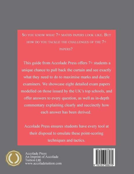 So you know what 7+ maths papers look like. But how do you tackle the unique challenges of the 7+ exams? This new guide from Accolade Press offers 7+ students a unique chance to pull back the curtain and see exactly what they need to do to maximise marks and dazzle examiners. We showcase eight detailed exam papers modelled on those issued by the UK's top schools, and offer thorough answers to every question, as well as in-depth commentary explaining exactly how each answer has been derived. Accolade Press ensures students have every tool at their disposal to emulate these point-scoring techniques and tactics ¿ Eight maths papers that mimic the length and difficulty of those issued by the UK's top private and grammar schools. Suitable for upcoming exams in 2022, 2023, 2024 and 2025. ¿ Papers split into separate formats so that students can familiarise themselves with the diverse styles of papers seen in the highly competitive 7+ field. ¿ Thorough answers for every question. ¿ In-depth explanations to accompany every model answer. These clearly and succinctly explain how each and every answer has been derived. ¿ Written by experienced tutors with a stellar track-record in 7+ admissions.