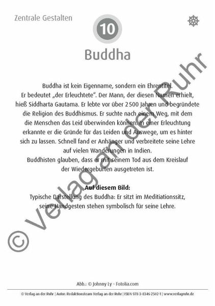 Bildkarten für Grundschule und Sekundarstufe I, Fächer: Katholische Religionslehre, Evangelische Religionslehre, Ethik, LER; Klasse 3-10 +++ Wenn Sie die Weltreligionen in Ihrem Religions- oder Ethikunterricht behandeln, finden Sie in diesem Unterrichtsmaterial viele hochwertige, farbige Fotos zu Christentum, Judentum, Islam, Hinduismus und Buddhismus. Die Bildersammlung ist geordnet nach den Themen: Wichtige Figuren (Gründer, Gottesvorstellungen, Vertreter), Heilige Orte, Symbole, Bräuche, Schriften und Gegenstände. Die Kartenrückseite informiert die Schüler über wichtige Hintergründe. In der Lehrerhandreichung finden Sie zahlreiche Anregungen, wie Sie die Bild- und Fotokartei für den Unterricht nutzen können: als Impulsgeber zum Erzählen, Schreiben, Nachdenken oder Diskutieren, als Informationskarten oder meditatives Element. Die Bilder bereichern Gesprächsrunden, Einstiege oder Reflexionsphasen und sind ebenso für den offenen Unterricht geeignet wie für Pädagogen in der außerschulischen Kinder- und Jugendarbeit. Religionen: Christentum, Judentum, Islam, Hinduismus, Buddhismus, Themen: Wichtige Figuren, Heilige Orte, Symbole, Bräuche, Bedeutsame Schriften und Gegenstände - mit Sachinfos auf der Kartenrückseite