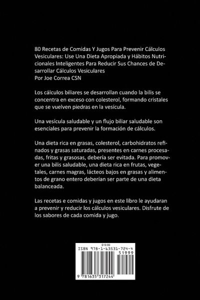 80 Recetas de Comidas Y Jugos Para Prevenir Cálculos Vesiculares: Use Una Dieta Apropiada y Hábitos Nutricionales Inteligentes Para Reducir Sus Chances de Desarrollar Cálculos Vesiculares Por Joe Correa CSN Los cálculos biliares se desarrollan cuando la bilis se concentra en exceso con colesterol, formando cristales que se vuelven piedras en la vesícula. Una vesícula saludable y un flujo biliar saludable son esenciales para prevenir la formación de cálculos. Una dieta rica en grasas, colesterol, carbohidratos refinados y grasas saturadas, presentes en carnes procesadas, fritas y grasosas, debería ser evitada. Para promover una bilis saludable, una dieta rica en frutas, vegetales, carnes magras, lácteos bajos en grasas y alimentos de grano entero deberían ser parte de una dieta balanceada. Las recetas e comidas y jugos en este libro le ayudaran a prevenir y reducir los cálculos vesiculares. Disfrute de los sabores de cada comida y jugo.