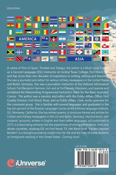 A native of Port-of-Spain, Trinidad and Tobago, the author is a Multi-Level English as a Second Language (ESL) Instructor at Central Texas College, Fort Hood, TX., and has more than two decades of experience in writing, editing and teaching. She was a journalist and editor for various military newspapers in the United States and Berlin, Germany. She was a journalism instructor at the Defense Information School, Fort Benjamin Harrison, Ind. and at Fort Meade, Maryland, and rewrote and revitalized the Newswriting Programmed Instruction Book for the Basic Journalist Course. The author was a narrator and editor with the Public Affairs Office, First Cavalry Division, Fort Hood, Texas, and as Public Affairs Chief, wrote speeches for the command group. She is familiar with several languages and graduated in the top ten percent of the Russian Language Course at the Defense language Institute, DLI, Monterey, California. She has written poems, in brochure format and articles for Civilian and military newspapers in the U.S and Berlin, Germany. Her first book, with students' accounts, written in English and their native languages, and published in 2015, is a fascinating window into the experiences of immigrant students, from one dozen countries, studying ESL on Fort Hood, TX. Her third book "Barriers beyond Borders" is a thought provoking insight into her life, and the lives of some students, as immigrants residing in the United States. Coming soon!