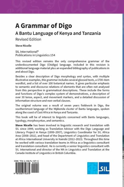This revised edition remains the only comprehensive grammar of the underdocumented Digo (Chidigo) language. Included in this revision is additional language material plus an expanded bibliography of publications in and about Digo. Besides a clear description of Digo morphology and syntax, with multiple illustrative examples, this grammar includes several glossed texts, a 1700-item wordlist, and a list of over 100 botanical names. It gives particular emphasis to semantic and discourse relations of elements that are often not analysed from this perspective in grammatical descriptions. These include the forms and functions of Digo's complex system of demonstratives, a description of over 30 tense, aspect, and movement markers, and a detailed discussion of information structure and non-verbal clauses. The original volume was a result of seven years fieldwork in Digo, the southernmost language of the Mijikenda cluster of Bantu languages, spoken along the coast of East Africa in Kenya and Tanzania. This book will be of interest to linguists concerned with Bantu languages, typology, morphosyntax, and semantics.